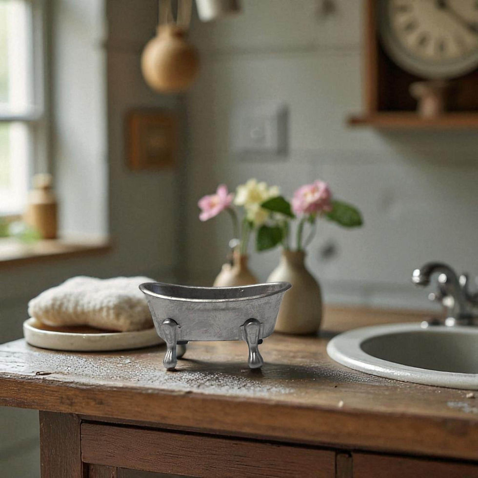 Mini Clawfoot Bathtub Planter | Silver Metal Soap Dish | Farmhouse Bathroom